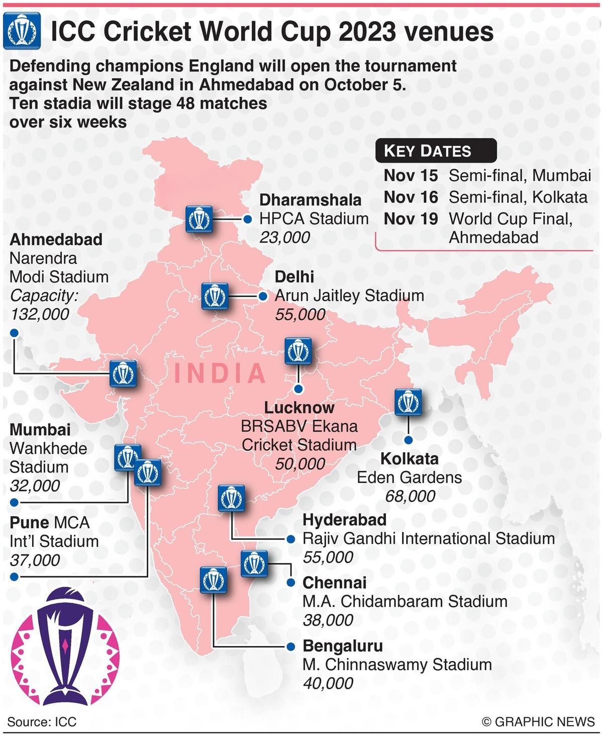 The tournament began with an England vs New Zealand match at Narendra Modi Stadium in Ahmedabad. The 48 matches of the World Cup will be held across 10 venues across India, which is hosting the flagship tournament for the fourth time, and the first since Team India’s 2011 World Cup triumph. India will be playing their matches in Chennai, Delhi, Ahmedabad, Pune, Dharamsala, Lucknow, Mumbai, Kolkata, and Bengaluru. The Rajiv Gandhi Stadium in Hyderabad is the only venue where India does not have a league match scheduled.